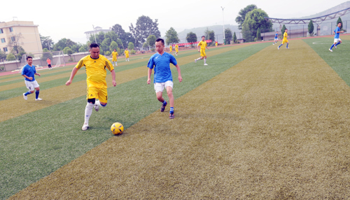 7月6日上午10點,該縣岑鞏中學比賽現場足球飛旋,來自該縣黨政、思陽兩支代表隊20多名足球運動員各穿著統一的球衣馳騁在綠茵賽場上,兩邊的守門員正緊張地注視著場中情況。