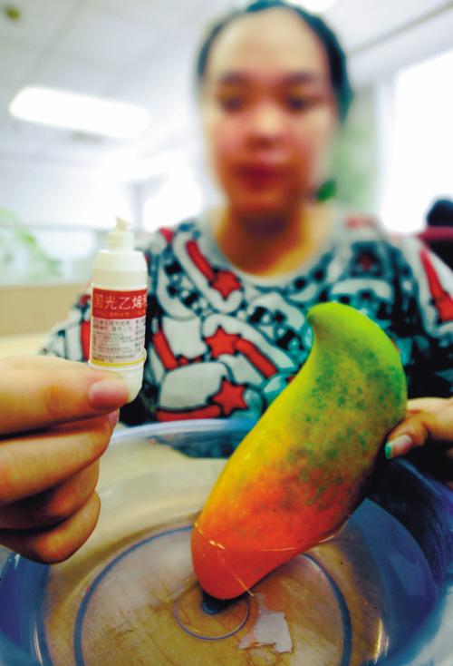 剛剛長成的芒果,經過一天就可以褪掉青衣換上金燦燦的外衣?記者在沈陽農業大學附近的農資商店購買了一瓶乙烯利,按照上面所說的比例兌上水后,把一只青芒果放入了半盆水中。經過26個小時后,被浸泡在乙烯利溶液中的青芒果明顯變黃,而沒被浸泡在乙烯利溶液中的另一半芒果則還是呈青色。