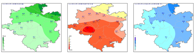 降水量:4月上旬我州各地降水量為2.2~31.4mm (圖2左);與歷年同期相比偏少4.8~92.8 % (圖2中);旬內日降水量≥0.1mm的日數2~7d (圖2右),旬內降水主要集中在7日,全州普降小到中雨。