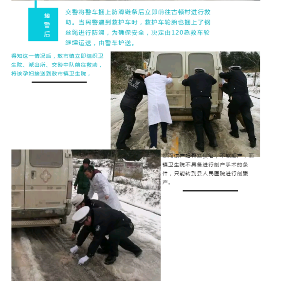 通過努力,最后平安將送到黎平縣人民醫院。產婦家屬告訴民警,生第一胎時也是剖腹產,家住鄉下,交通又不便利,第一次聯系醫院時,因為道路積雪120急救車不能到達時十分著急,沒想到在困難時黎平的黨員干部、警察及醫務人員伸出了援助之手,自己十分感動。
