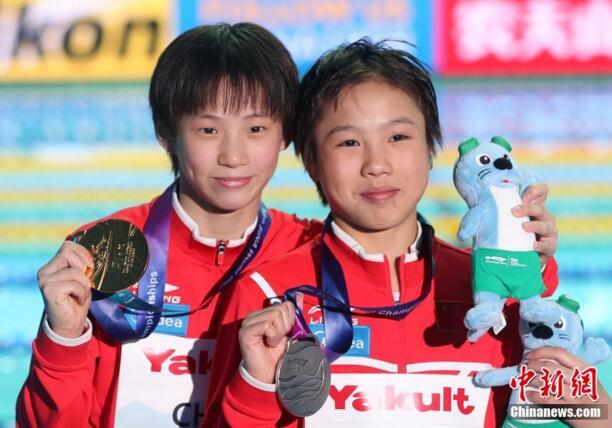 7月17日,中國選手陳芋汐(左)與盧為合影。當日,在韓國光州舉行的世界游泳錦標賽跳水女子十米臺決賽中,中國選手陳芋汐以439分奪得冠軍,中國選手盧為以377.80分獲得亞軍。韓海丹 攝