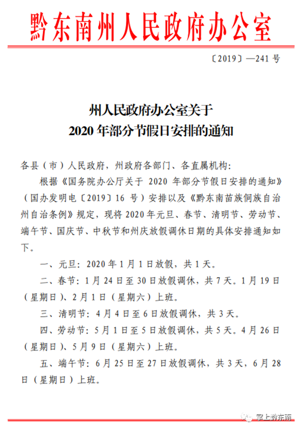 根據《黔東南苗族侗族自治州自治條例》第六十一條規定,每年自治州成立紀念日,假期2天,現將2020年州慶放假安排通知如下:州慶:7 月 23 日(星期四)、7 月 24 日(星期五)放假, 與周末連休。