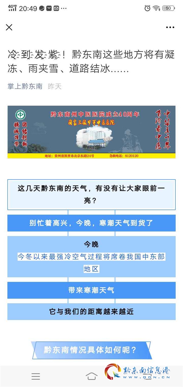 本網訊 根據中央氣象臺發布今冬首個最高寒潮橙色預警,貴州省和黔東南州氣象預報,2020年12月28日晚開始,黔東南州出現寒潮天氣,高海拔地區有凍雨和雨夾雪,日最低氣溫-4至0℃,部分路段伴有道路結冰,且局地有霧。12月28日,黔東南州公安局交警支隊啟動一級勤務,全面進入戰時狀態,一律取消休假休息,全員在崗在位,全力做好第二輪雨雪凝凍惡劣氣候道路交通安全保暢工作。