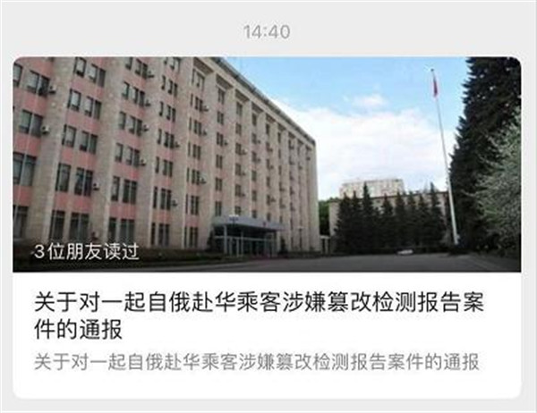 通報指出,近日,我館在反查自俄羅斯輸入病例核酸和血清抗體檢測報告時發現,1 名中國公民涉嫌篡改檢測結果,相關情況如下: