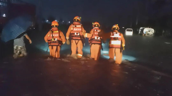 救援人員到達現場后,立即對該路段情況進行偵查。此時,積水已淹至車身。車內有包括一名小孩和老人在內的四名群眾,且暴雨還在持續,情況危急。現場指揮員立即下達命令,一組人員負責警戒觀察周圍情況,一組負責救援被困群眾,經過近十分鐘救援,被困群眾被成功救出轉移到安全地帶。