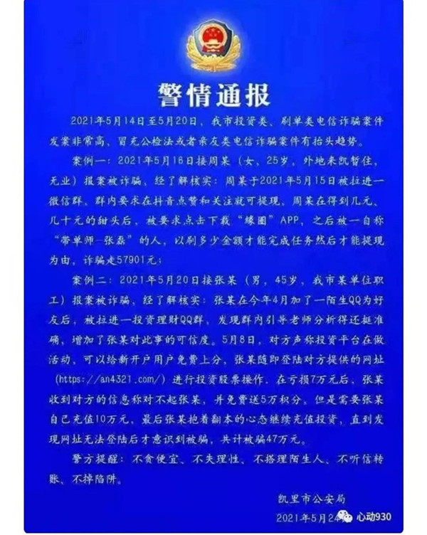 2021年5月14日至5月20日,凱里市投資類、刷單類電信詐騙案件發案非常高,冒充公檢法或者親友類電信詐騙案件有抬頭趨勢。