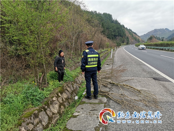 本網訊 3月31日上午,凱里高速公路管理處雷山路政執法大隊路政員開展日常巡查至G60滬昆高速K1643+800上行時,發現一名老人佝僂著背在高速路旁拾柴,旁邊的車輛不停呼嘯而過,十分危險。路政員立即將車輛停靠在安全地帶,上前制止了老人這一危險行為。