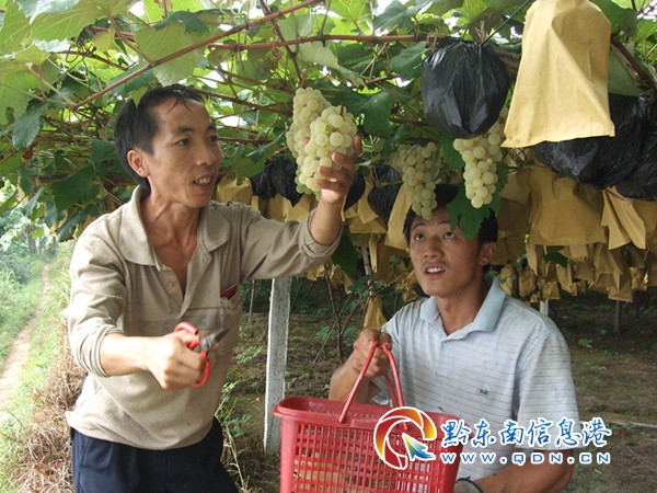 本網訊 眼下,正是瓜果飄香的時節,走進雷山縣丹江鎮腳猛村,就像走進了葡萄的世界。葡萄架下不時傳出陣陣爽朗的笑聲,人群中有忙著采摘的果農,有趁周末前來觀光采摘的游客。游客們嘻嘻哈哈拿著園主人提供的剪刀,輕輕地剪下一小串,摘下一粒葡萄,揭開薄薄的皮,急不可待地放進嘴里;有的一邊品嘗葡萄一邊“嘖嘖”地咂嘴,還不時地擺出各種造型拍照留念……
