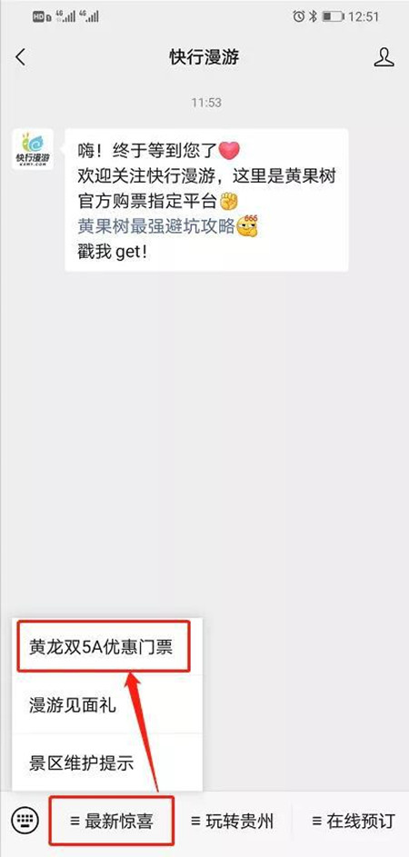 (1)進入快行漫游公眾號,點擊最新驚喜—黃龍雙 5A 優惠門票;