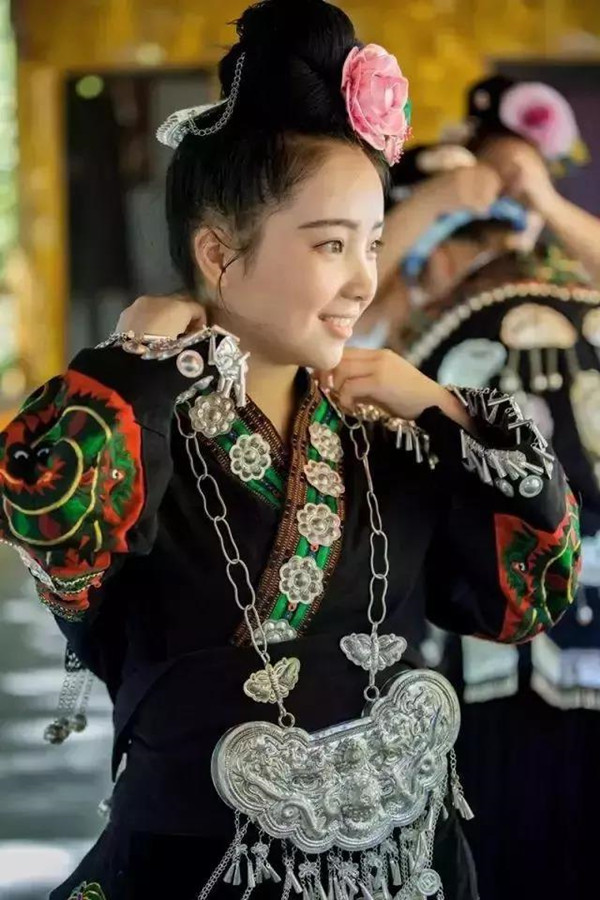 節日里的蘆笙舞豪放激情,舞步奔放歡快,五彩斑斕的女子盛裝繡工精致美麗,圖案大氣、飄逸,色彩鮮艷奪目,以花、鳥、鳳凰、龍等吉祥物為主要圖案,綴在衣、袖、圍腰突出醒目的地方,展示美麗和富貴。