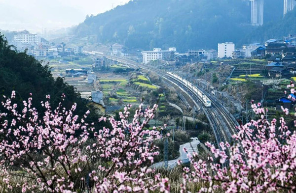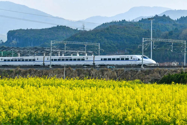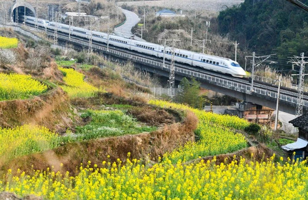 ↑2月23日,一列動車組列車在貴廣高鐵貴州省從江縣洛香鎮(zhèn)段附近行駛。