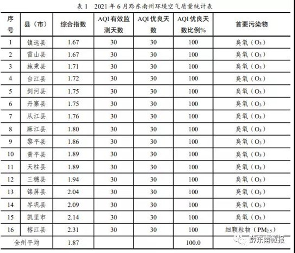 2021 年 6 月,全州 AQI 優良天數比例為 100%,16 個縣(市)AQI 優良天數比例均為 100%。