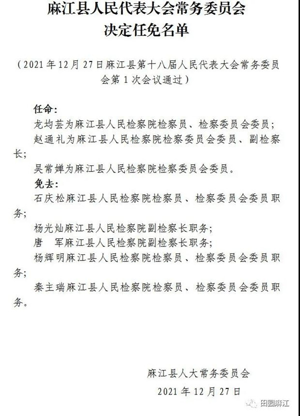 會議依法進行人事任免,任命薛斌同志為縣人民政府副縣長,陸顯著同志為縣農業農村局局長,楊文艷同志為縣文體廣電旅游局局長,龍獻良同志為縣工業信息化和商務局局長,謝隆珍同志為縣人民法院副院長,龍琦同志為縣人民法院副院長、審判委員會委員,潘先菊、閆安義同志為縣人民檢察院副檢察長,楊忠瓊同志為縣人民法院審判委員會委員,袁再亮同志為柳川鎮人民法庭庭長。