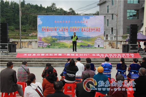 本網訊 為深入推進道路交通事故預防“減量控大”工作,進一步強化農村地區交通安全宣傳教育工作。10月18日上午,天柱縣公安局交警大隊民警借助縣文廣局在藍田鎮開展的“人文天柱·志愿黔行”送文藝進鄉村演出活動的契機,走上舞臺,向前來觀賞節目的村民們宣講交通安全知識。