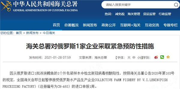 因從俄羅斯進口 1 批凍狹鱈魚的 1 個外包裝樣本中檢出新冠病毒核酸陽性,按照海關總署公告 2020 年第 103 號的規定,全國海關自即日起暫停接受俄羅斯水產品生產企業 COLLECTIVE FARM FISHERY BY V.I.LENIN ( FISH PROCESSING FACTORY ) (注冊編號為 CH-A93)的進口申報 1 周。