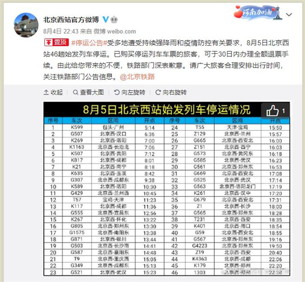 受多地遭受持續強降雨和疫情防控有關要求,8 月 5 日北京西站 46 趟始發列車停運。已購買停運列車車票的旅客,可于 30 日內辦理全額退票手續。由此給您帶來的不便,鐵路部門深表歉意。請廣大旅客合理安排出行時間,關注鐵路部門公告信息。
