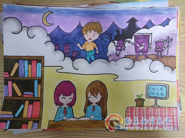期間,宣講團成員還給同學們發放了綠書簽和宣傳海報500份。同時,組織學生們開展“健康上網,拒絕有害出版物及信息”的繪畫活動。