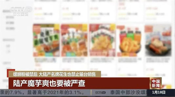 臺(tái)經(jīng)濟(jì)部門17日晚間宣布,大陸產(chǎn)某知名麻辣花生不準(zhǔn)進(jìn)入臺(tái)灣市場(chǎng),大陸零食魔芋爽必須經(jīng)許可方可輸入銷售。同時(shí),對(duì)這些商品銷售的監(jiān)管也包括電商平臺(tái)。