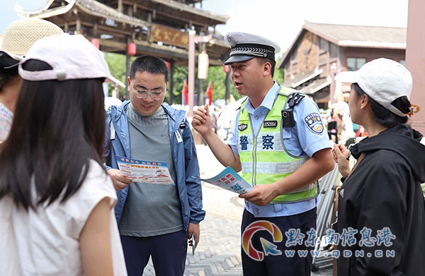 本網訊 7月22日,貴州省丹寨縣交警大隊組織宣傳民警走進轄區萬達小鎮,向旅游度假的游客群眾開展交通安全宣傳,通過發放宣傳彩頁及“面對面”拉家常等方式向游客們講解超員超速、疲勞駕駛、酒后駕駛、分心駕駛、強超強會等交通違法行為的危害,提醒游客們騎乘摩托車要佩戴好安全頭盔、駕乘車輛要系好安全帶,要時刻做好自身安全防護,牢固樹立交通安全意識,全力為廣大游客營造了良好的道路交通安全氛圍。